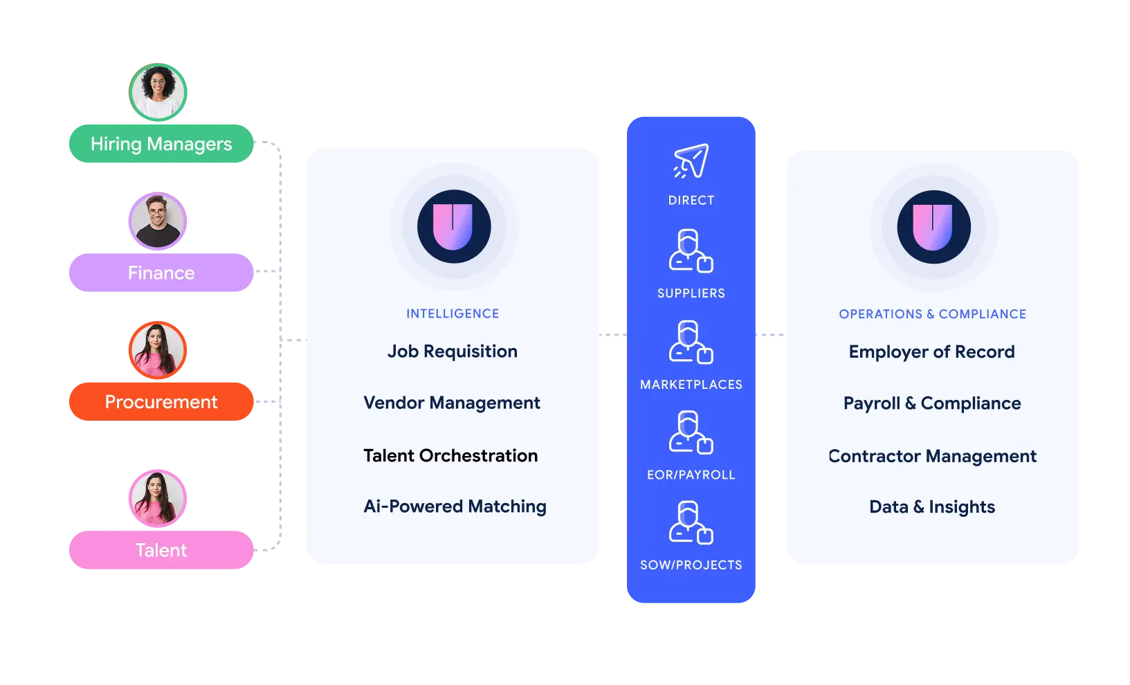 Orchestration means coordinating systems, suppliers, workflows, and data across the entire contingent workforce lifecycle. Upplft acts as the control layer that connects existing tools and enforces consistent processes, rather than replacing them.